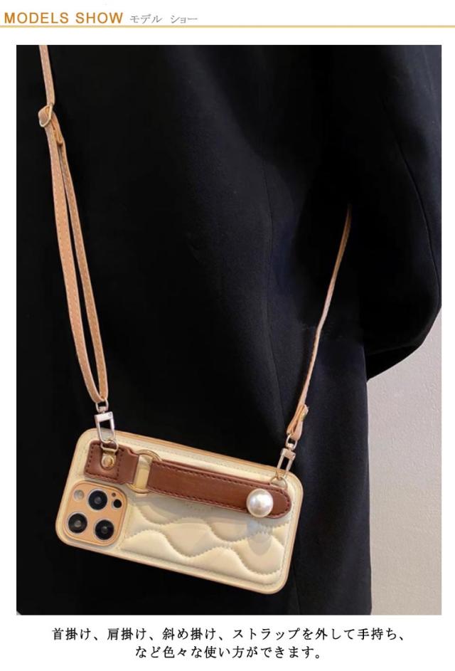 韓国 ショルダーベルト付き iPhoneケース ショルダーベルト付き 携帯ケース スマホケース 可愛い お洒落 パール付き キルティング 斜め掛け レザー ケース シンプル ショルダーストラップ iPhone15Pro
