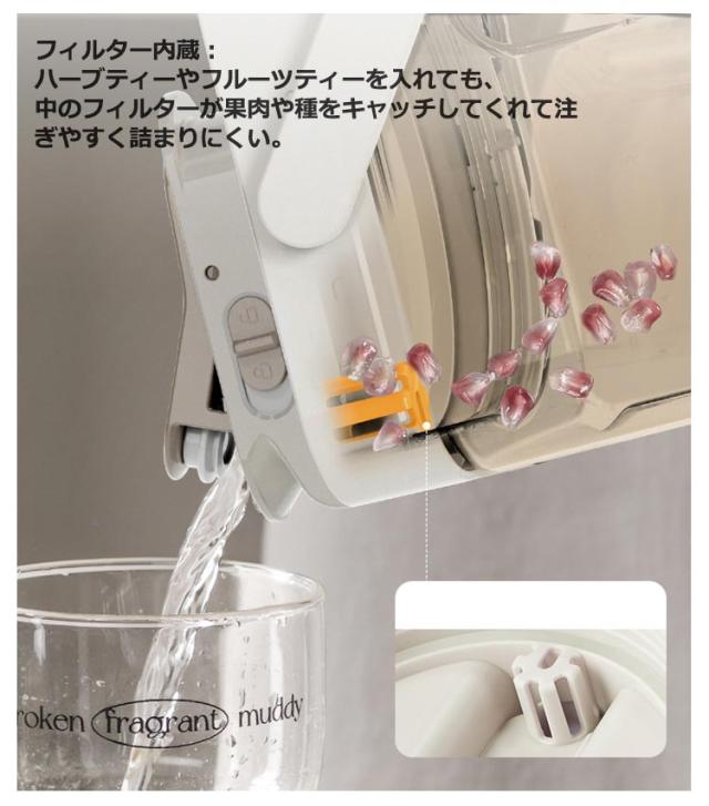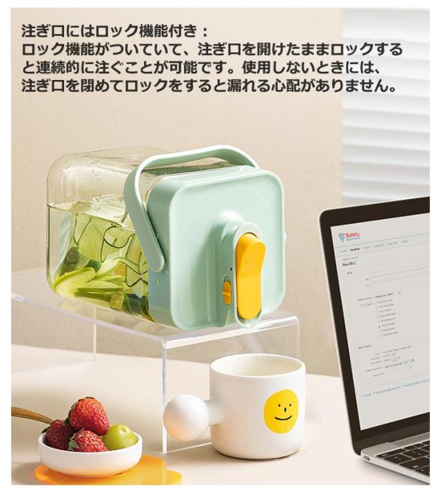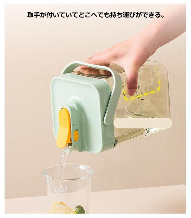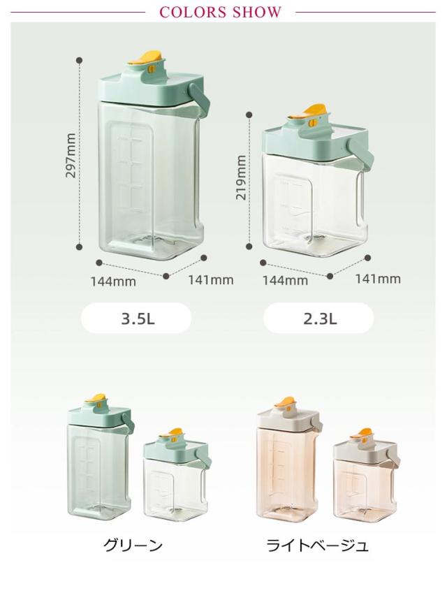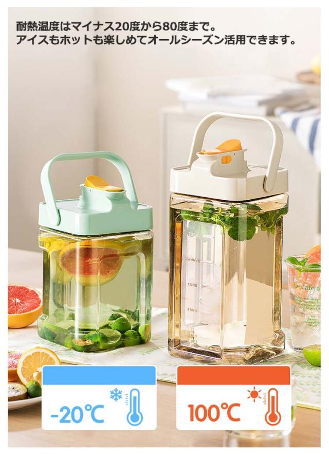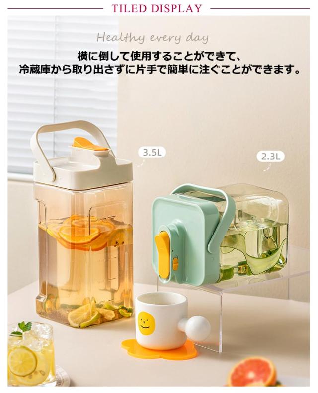 | 見た目はもちろん機能性も抜群の冷水筒。【2.3L?3.5L】2サイズあり 取手が付いていてどこへでも持ち運びができる 横に倒して使用することができて、冷蔵庫から取り出さずに片手で簡単に注ぐことができます。 高密封だから、持ち運びにも便利で倒れても水漏れしません。 フィルター内蔵:ハーブティーやフルーツティーを入れても、中のフィルターが果肉や種をキャッチしてくれて注ぎやすく詰まりにくい。 注ぎ口にはロック機能付き:ロック機能がついていて、注ぎ口を開けたままロックすると連続的に注ぐことが可能です。使用しないときには、注ぎ口を閉めてロックをすると漏れる心配がありません。 ボトルの口が大きめ:ボトル容器の口部分は、大きめの作りなので果物やお花なども入れやすくお手入れがしやすいのもポイントです。 3.5リットルの大容量:500mlのペットボトルが7本分も入る冷水筒は、大家族におすすめです。パーティやピクニックにも大活躍してくれます。 耐熱温度はマイナス20度から80度まで。アイスもホットも楽しめてオールシーズン活用できます。 | |