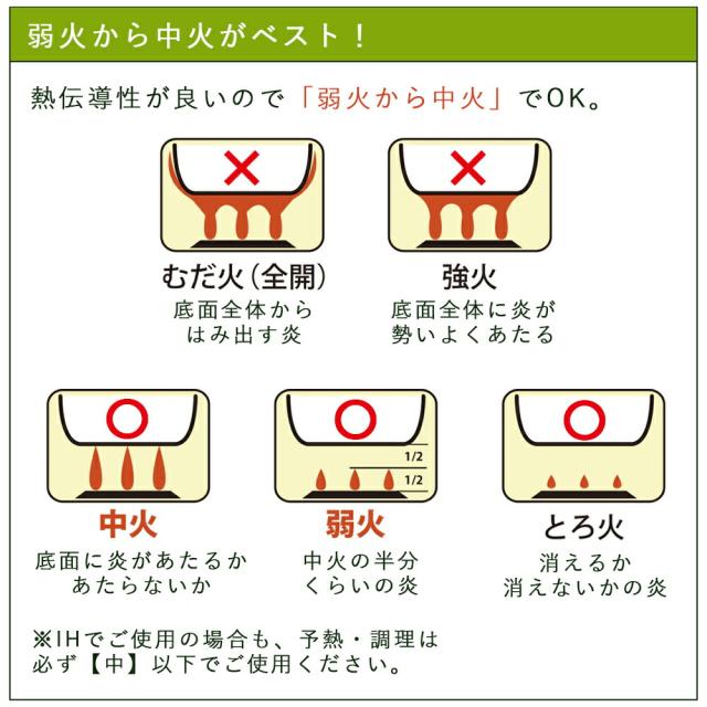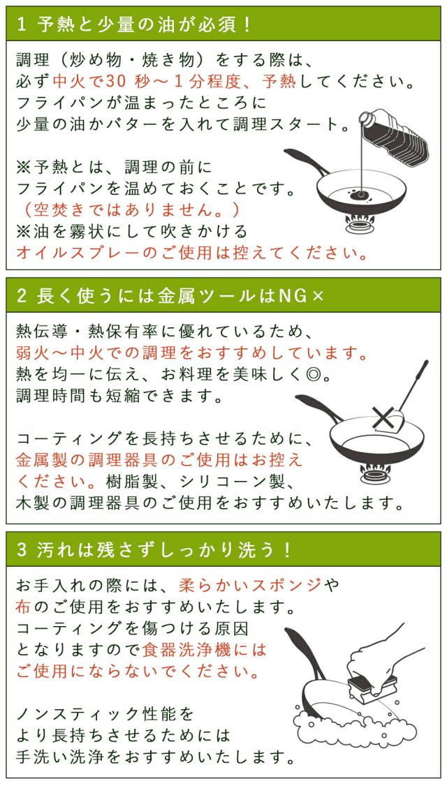 | グリーンパン使いこなしのコツ 最適な火加減でご使用の上、正しいお手入れをしていただくことで、性能を十分に引き出し、長く・快適にご愛用いただくことができます。 はじめてご使用になる前に 〇梱包資材やラベルなどは全て取り除いてください。 使い方のポイント