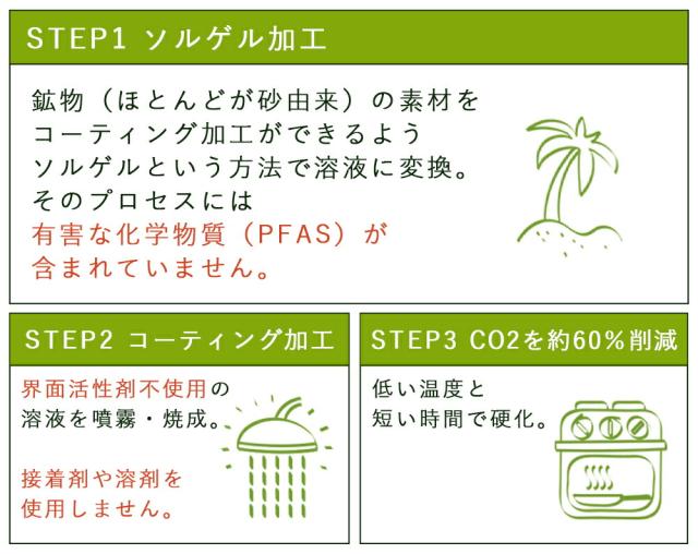 フッ素樹脂を使わないノンスティッククックウェア 2007年、有害なPFASを一切含まない、砂由来と同じ原料からなるセラミックノンスティックコーティング「Thermolon™(サーモロン)」を開発。 Thermolon™(サーモロン)とは 主に砂と同じ成分の原料でできている素材。グリーンパンが特許を取得しているセラミックコーティングです。有害な化学物質が含まれていません。 | グリーンパンの製造について