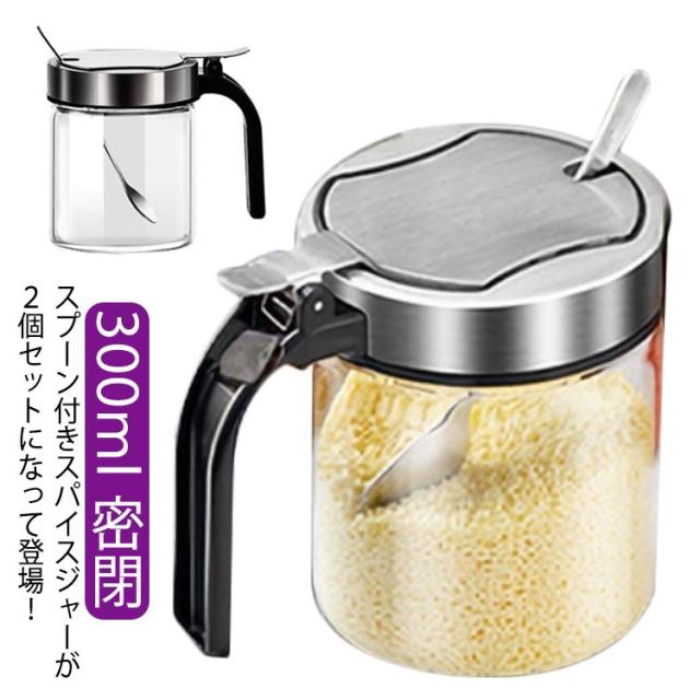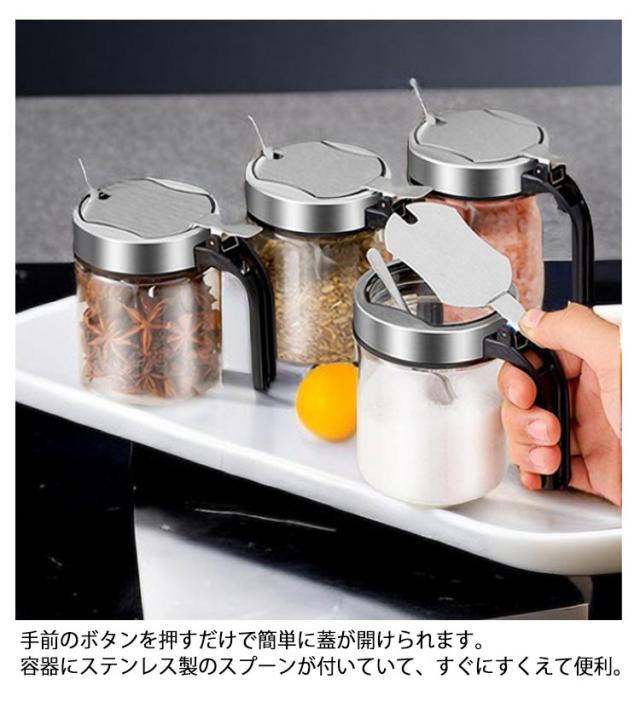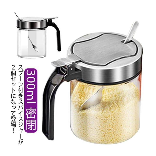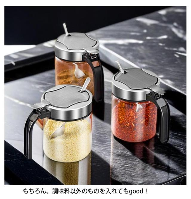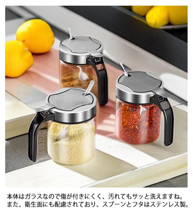 3個セット!ステンレス スパイスジャー キッチン用品 ガラス 密閉 調味料入れ 塩入れ 調味料ポット スパイスボトル おしゃれ 300ml ポット 砂糖 調味料ケース 片手開閉 調味料容器 保存容器 3個セット!ステンレス スプーン付き