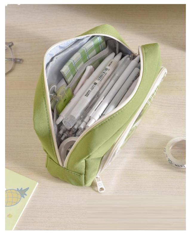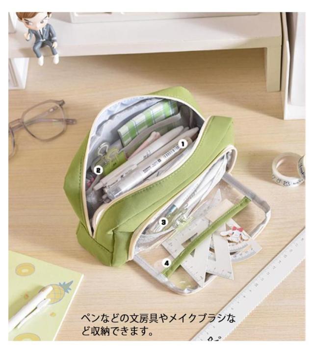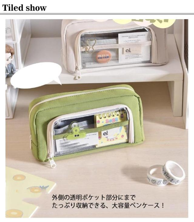 | ※クリップなどアクセサリーは付属しません。 外側の透明ポケット部分にまでたっぷり収納できる、大容量ペンケース! トレンドの韓国っぽさたっぷりで可愛いペンケース しっかりとした生地と豊富カラーがおしゃれ! ペンなどの文房具やメイクブラシなど収納できます。 | |
