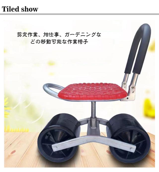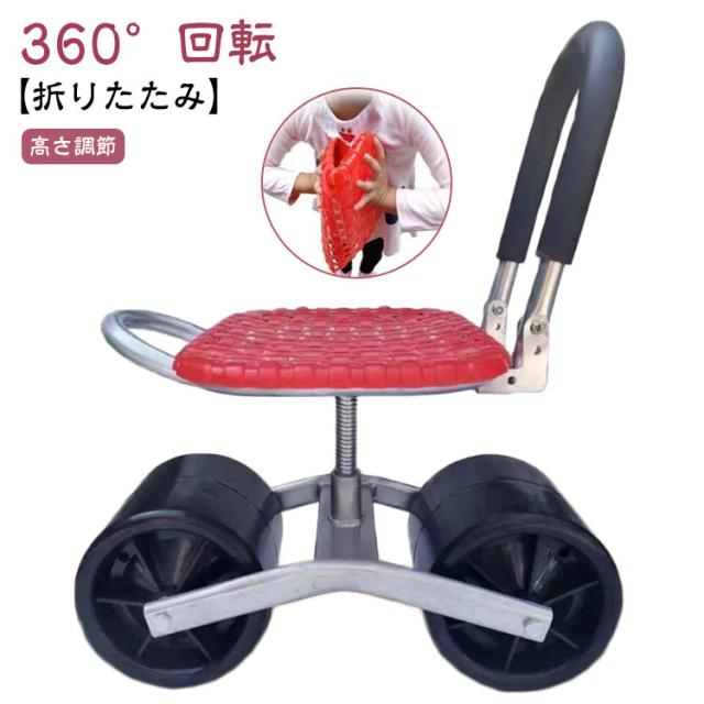 | 【360°回転】【折りたたみ】【高さ調節】 剪定作業、畑仕事、ガーデニングなどの移動可能な作業椅子 シートは360度回転するので、作業場所を選びません。 低姿勢で作業しなければならないときもこれがあれば腰掛けて楽に作業ができます。 ガーデニング作業や畑仕事で中腰や腰をかがめたりする作業の時、膝や腰の痛みや疲れを軽減します。 編み模様の座面は穴が沢山あり、通気性抜群で、暑い季節も蒸れずにとても快適な座り心地◎ 軽量&持ち手付きなので、持ち運びも便利の腰掛け台車。 畦間での草取り、間引き、収穫作業などに最適の園芸用カート。 ワイドなタイヤで安定性抜群。 | |