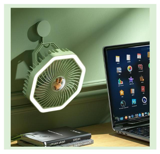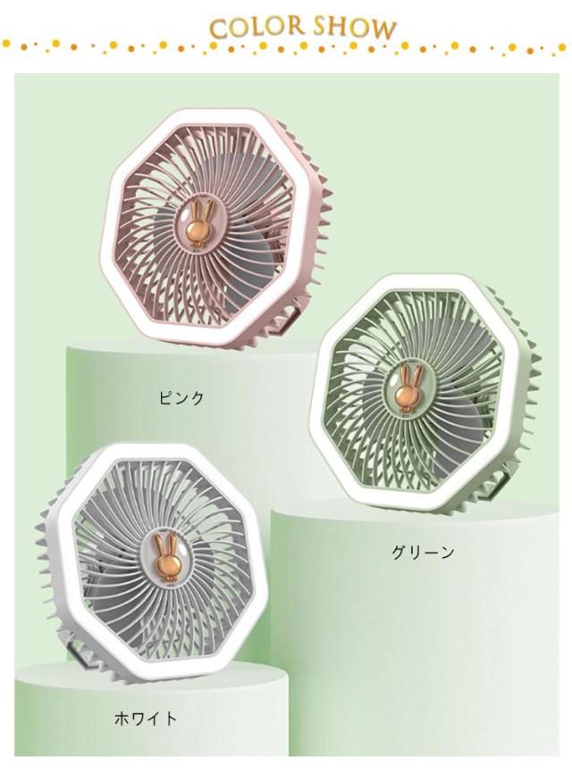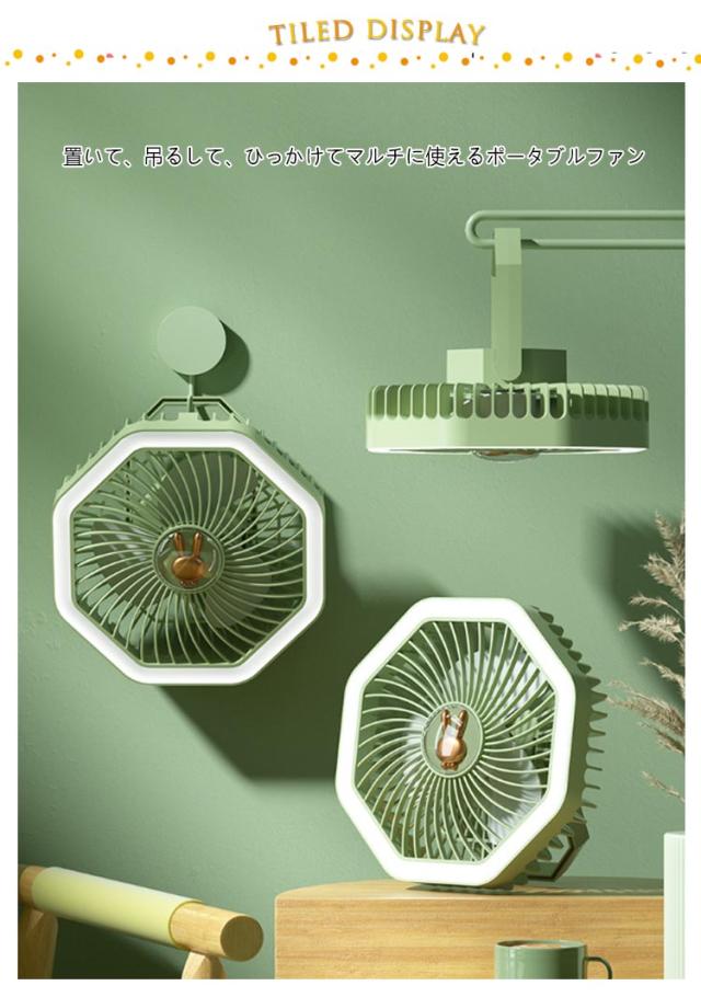 | 卓上&吊下げ&壁掛け 3way 置いて、吊るして、ひっかけてマルチに使えるポータブルファン 優しく光るLEDライト付き、夜間も便利 風量3段階調節可能 USB充電 | |