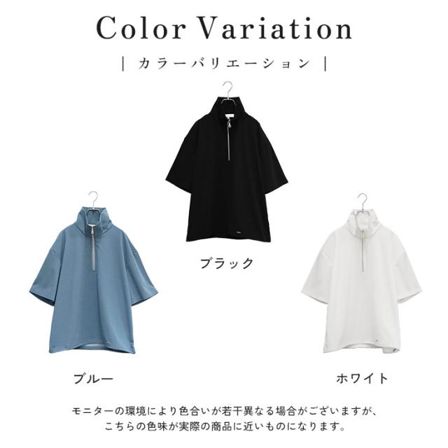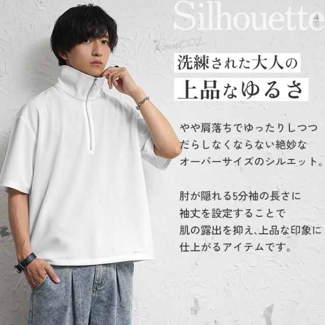 余計なデザインは何もない、シンプルなプルオーバータイプのハーフジップTシャツ。大きめに作られた襟が小顔効果をもたらします。スタンドネックになるので、襟を立てて着用すればモードな印象に。肘が隠れる5分袖の長さに袖丈を設計し、緩やかなオーバーサイズなので体型カバーにもぴったりのトップスです。