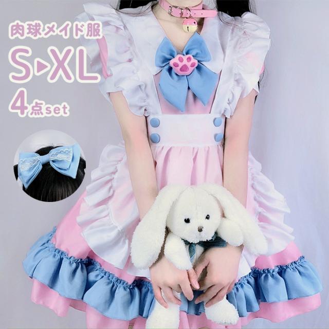 ハロウィン コスプレ 衣装 メイド服 4点セット エプロン 肉球 ネコ 大人 子供 女の子 膝丈 ミディアム 給仕服 仮装 飾り コスプレ衣装 キッズ用 女性 ファミリー フリル 萌え