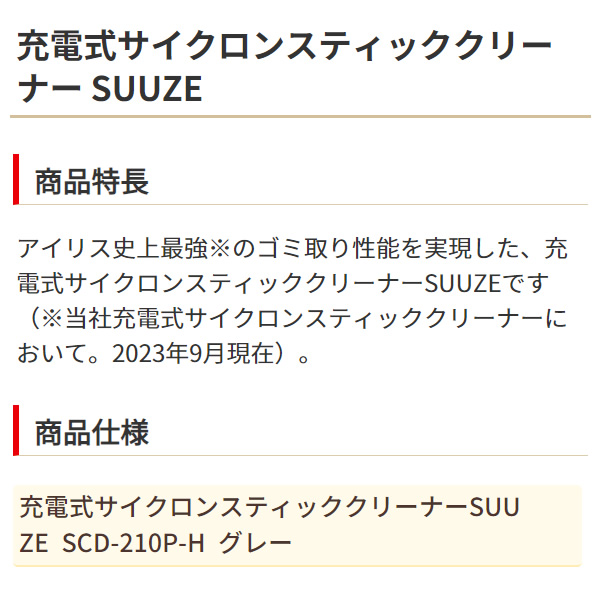 スティッククリーナー アイリスオーヤマ 充電式 サイクロン式 SUUZE グレー SCD-210P-H