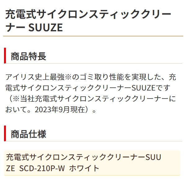 スティッククリーナー アイリスオーヤマ 充電式 サイクロン式 SUUZE ホワイト SCD-210P-W