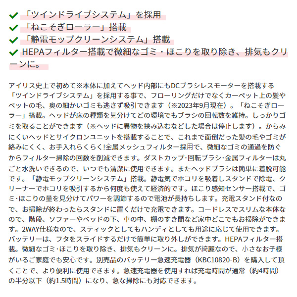充電時間が通常(約4時間)の半分以下(約1.5時間)になり、急な掃除にも対応できます。