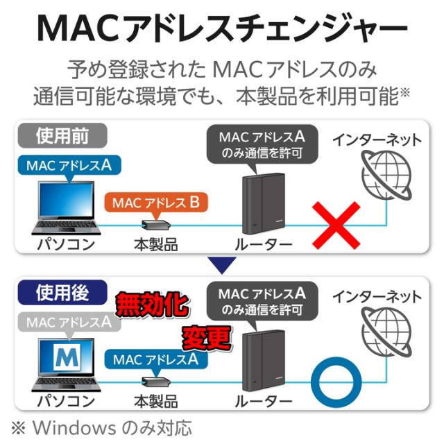 有線LANポートが無い薄型パソコンに最適!ドライバーインストールが不要なUSB-A 1Gbps有線LANアダプター。![]() ■有線LANポートが無い薄型パソコンに最適なUSB-A 1Gbps有線LANアダプター。 ■USB 5Gbps(USB3.2(Gen1))対応で、快速で安定したインターネット環境を実現。ドライバーのインストールが不要なので、LANアダプターをパソコンに接続するだけで有線LAN通信が可能になります。 ■本製品のMACアドレスを変更できるソフト「MACアドレスチェンジャー」(当社ホームページよりダウンロード)を使用することで、オフィスなどのあらかじめ登録されたMACアドレスのみ通信可能な環境でも、本製品を利用可能です。(Windowsのみ対応) ■ケーブルの長さは、持ち運びに便利な約9cmです。 ■自社環境認定基準を1つ以上満たし、『THINK ECOLOGY』マークを表示した製品です。 ■環境保全に取り組み、製品の包装容器が紙・ダンボール・ポリ袋のみで構成されている製品です。 ■環境にやさしいEU RoHS指令準拠。EU RoHS指令とは電気・電子機器に関する特定有害物質の使用制限についてEU(欧州連合)が決めた指令です。 ![]() ■対応OS(Windows):Windows 11/10 ■対応OS(macOS):macOS Ventura 13/macOS Monterey 12/macOS Big Sur 11/macOS Catalina 10.15 ■有線規格:IEEE 802.3ab(1000BASE-T)準拠/IEEE 802.3u(100BASE-TX)準拠/IEEE 802.3(10BASE-T)準拠/IEEE 802.3x(Flow Control)準拠 ■有線コネクター:RJ-45×1ポート ※Auto MDI/MDI-X、Auto-Negotiation対応 ■有線伝送速度(理論値):1000Mbps/100Mbps/10Mbps ■アクセス方式:CSMA/CD ■対応プロトコル:IPv4、IPv6 ■USBインターフェース:USB 5Gbps USB3.2(Gen1)/USB2.0/USB1.1 ■最大転送速度:USB3.2(Gen1)スーパースピード/5Gbps、USB2.0 ハイスピード/480Mbps、USB1.1 フルスピード/12Mbps ■USBポート(デバイス側):USB-A×1ポート ■その他機能:Jumbo frame 最大9KB(初期値無効) ※macOSでは非対応 ■定格入力:5V/900mA ■外形寸法:幅約69.8mm×奥行約25.9mm×高さ約15.5mm(ケーブル部分を除く) ■USBケーブル長:約9cm(コネクター部分を除く) ■質量:約30.5g(本体のみ) ■筐体材質(カラー):プラスチック(ホワイト) ■動作環境:温度:0〜40℃、湿度:85%以下(ただし結露なきこと) ■各種取得規格:VCCI Class B ■法令対応:EU RoHS指令準拠(10物質) ■保証期間:1年間 ■付属品:セットアップガイド ■対応ソフト:MACアドレスチェンジャー |