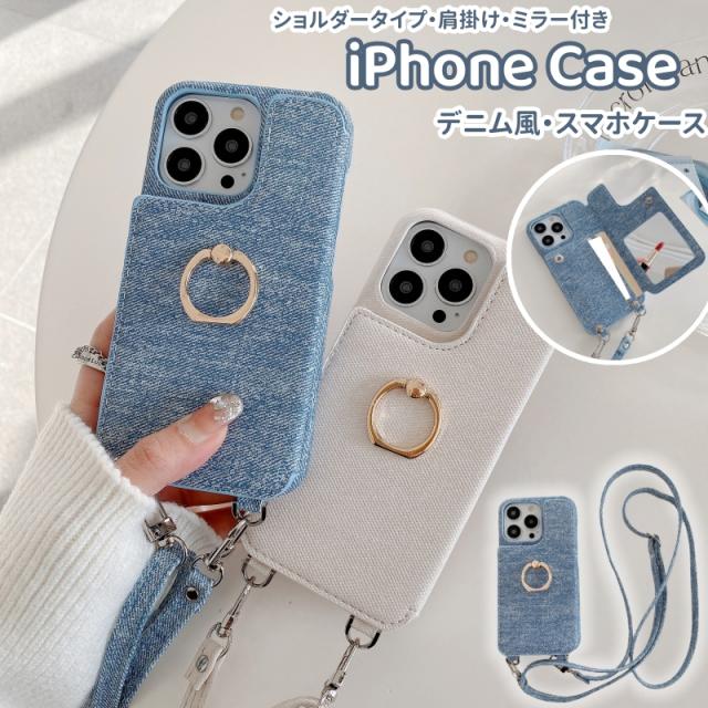 アイフォン 15 14 13 12 11 Pro Max デニム風 ケース リング ミラー カードポケット付き iPhone15 Plus x xmax xs xr ショルダータイプ カバー se 第 2 3 世代 かっこいい 頑丈 カバー 肩掛け 斜掛け iPhone 7 8 14Pro 15Pro 11Pro ショルダーストラップ iPhone14 iPhone13