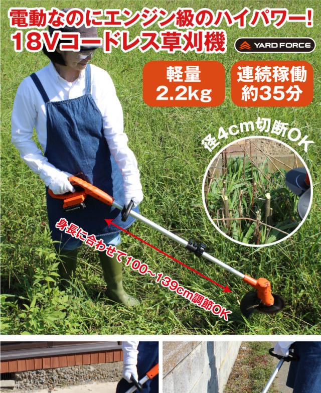 草刈機 コードレス 充電式 18V 草刈り機 安全 連続稼働35分 ヤードフォース社 yardforce 長さ調節 庭仕事 農作業 ガーデニング ナイロン刃 スチール刃