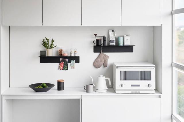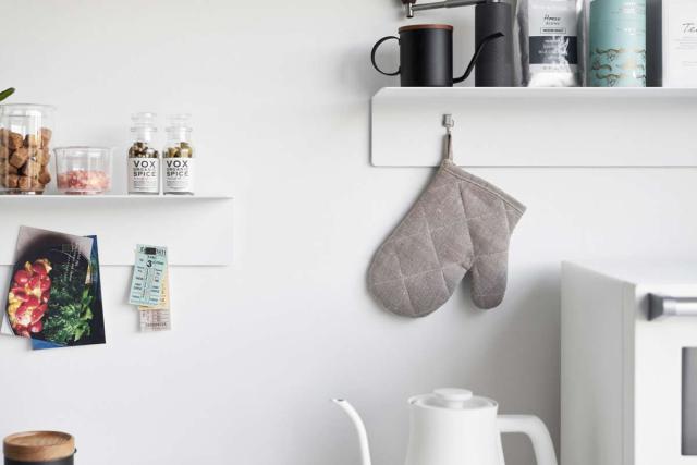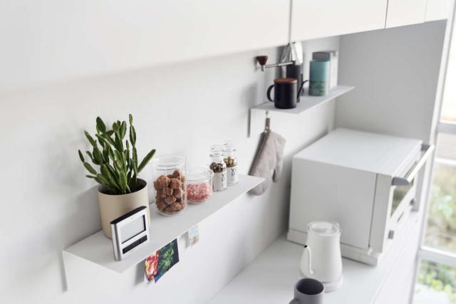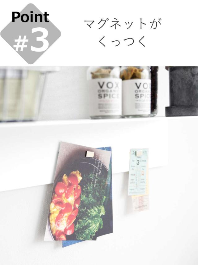 スチール製なので、マグネットをつけることができます。キッチンツールをマグネットフックで吊下げたり、小物やメモを貼りつけることができて便利です。