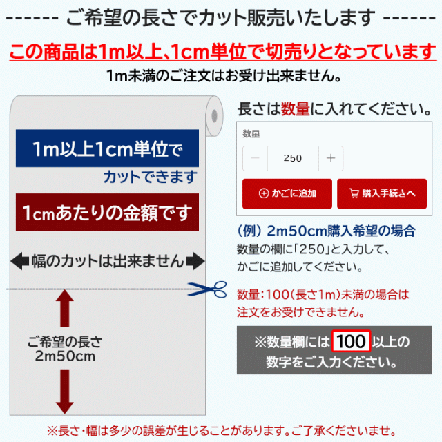 こちらの商品はセンチ単位の切り売りとなっております。 個数の欄にcm単位の数値を入力して下さい。(少数点は入力不可) 例:2m50cmご入用の場合、「数量250」でご注文下さい。 最短1mからの販売です。 数量は100以上でご入力下さい。 ※長さ・幅は誤差が生じることがありますのでご了承下さいませ。 ※幅のカットはできません。 |