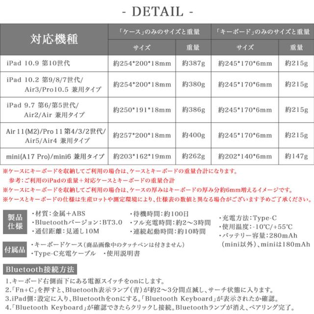【ケース材質】 ・ケースー表:PUレザー ・ケースー裏側:マイクロファイバー ・インナーケース:ソフトTPU ※インナーケースはiPad本体を嵌めるケースを指します。 【キーボード材質】 ・キーボード側はABS、背面部は金属 【ケース機能】 ・オートスリープ、ApplePencil収納、スタンド機能(無段階角度調整可) 【付属品】 ・キーボードケース (商品画像中のタッチペンは付きません) ・Type-C充電ケーブル ・使用説明書 【ケースとキーボードの仕様】 ・「各機種ケースとキーボードの詳細仕様」は商品説明画像をご確認ください。 |