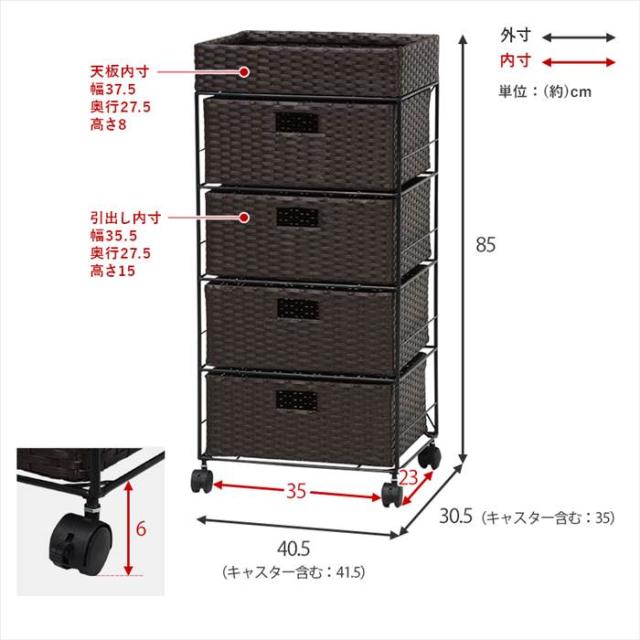 | 商品説明 | ・■キャスター付/■カゴ部内寸:約幅37.5×奥行27.5×高さ8cm ・■引出し内寸:約幅35.5×奥行27.5×高さ15cm |