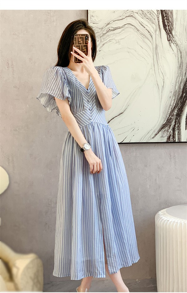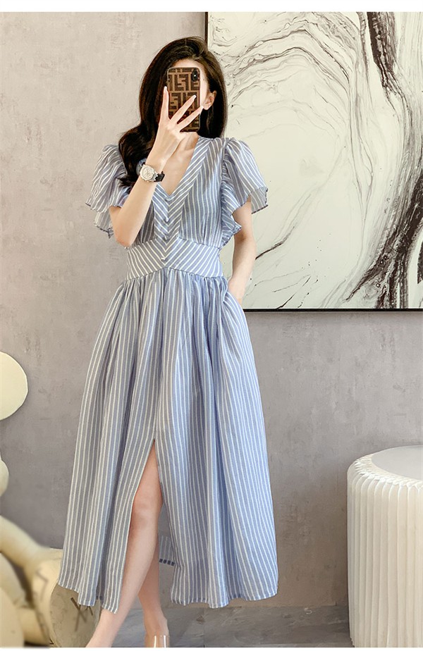 ストライプ柄 ワンピース レディース リゾートワンピース ブルー サマードレス ロング vネック半袖 Aライン ハワイ 沖縄 旅行用 大人 20代 30代 40代 可愛い お洒落 花柄 ふんわり フェミニン 薄手 体型カバー シースルー かわいい 大きいサイズ おしゃれ