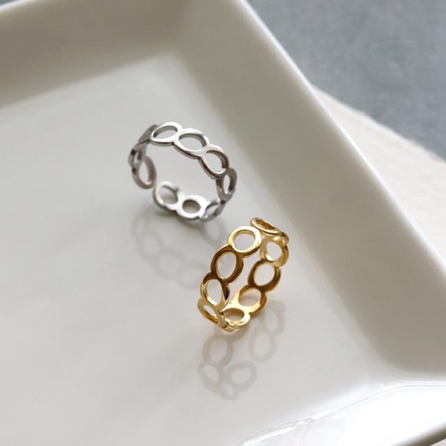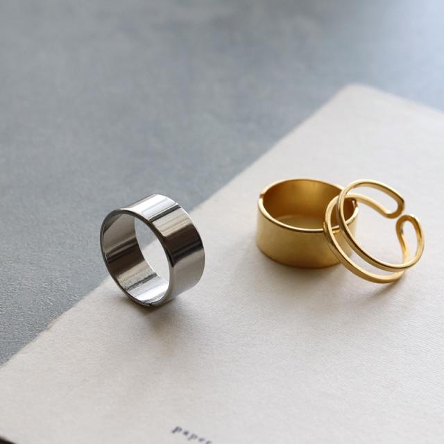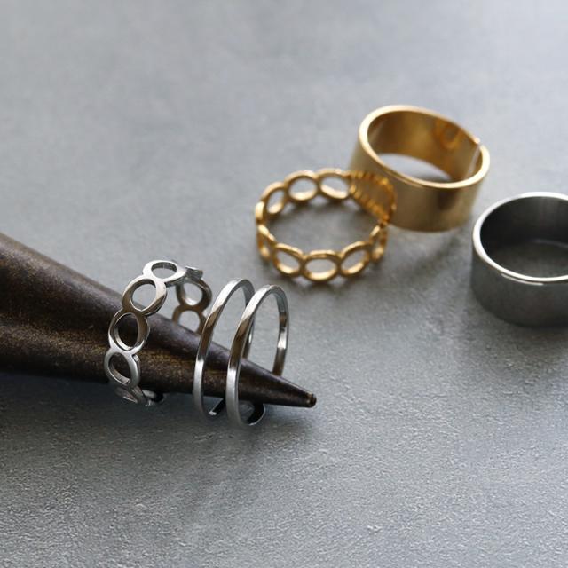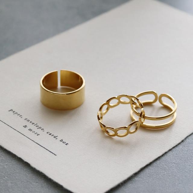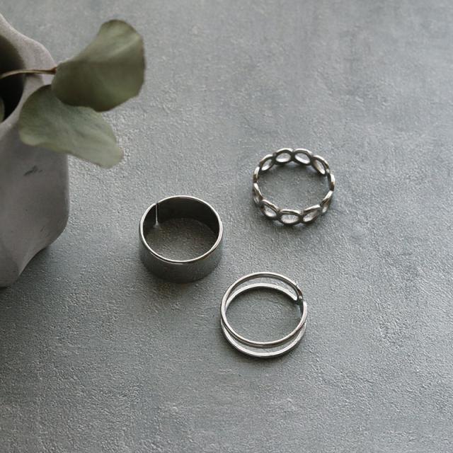 シンプルな幅広リング、チェーン風のオープンリング、2連風リングの3点セット。