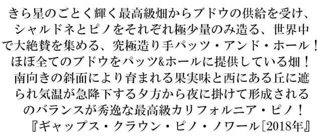 きら星のごとく輝く最高級畑からブドウの供給を受け、 シャルドネとピノをそれぞれ極少量のみ造る、世界中 で大絶賛を集める、究極造り手パッツ・アンド・ホール! ほぼ全てのブドウをパッツ&ホールに提供している畑! 南向きの斜面により育まれる果実味と西にある丘に遮 られ気温が急降下する夕方から夜に掛けて形成される のバランスが秀逸な最高級カリフォルニア・ピノ! 『ギャップス・クラウン・ピノ・ノワール[2018年』