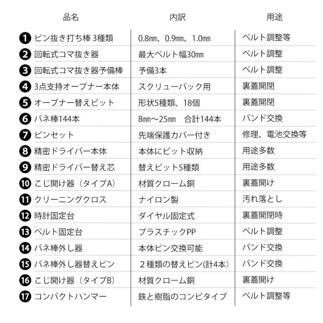 あなたの時計のメンテナンスやカスタマイズに関するすべてのニーズを満たします工具セットの登場。 このセットには、電池交換からベルト調整、バンド交換まで、時計修理のあらゆる面をカバーするための17種類、合計185点の専門工具がセットになっています。 プロの時計職人から初心者まで、どなたでもこのセットを使って、時計店や修理店に行くことなく、自宅で簡単に時計のメンテナンスやカスタマイズを行うことができます。 各ツールは、耐久性があり高品質な材料で作られており工具としての高い精度があります。 このセットには、時計の裏蓋を開けるためのさまざまな種類のケースオープナー、微細な調整を可能にするピンセット、バンドのサイズ調整を行うためのリンクピンリムーバーなど、 あらゆる修理作業に必要なツールが含まれています。また、それぞれのツールは使いやすく設計されているのも特徴です。 時計コレクションを自分で管理し、お気に入りの時計をいつでも最高の状態に保つために、この工具セットがあればもうプロに頼る必要はありません。 ※この商品の説明書は英文となります。日本語の説明書は付属しませんのでこのWEBページを参考にしてご利用ください。 |