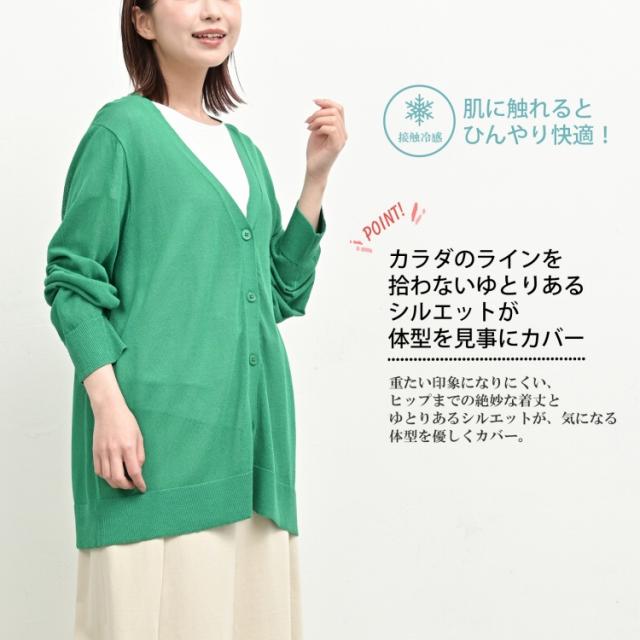 さらりと羽織れる シアーニットカーディガン。 ひんやり冷たい接触冷感機能付き。 軽くて持ち運びがしやすく 冷房対策や日除けにも最適な1枚です。 |