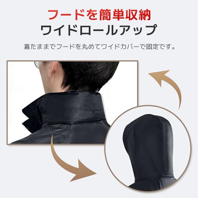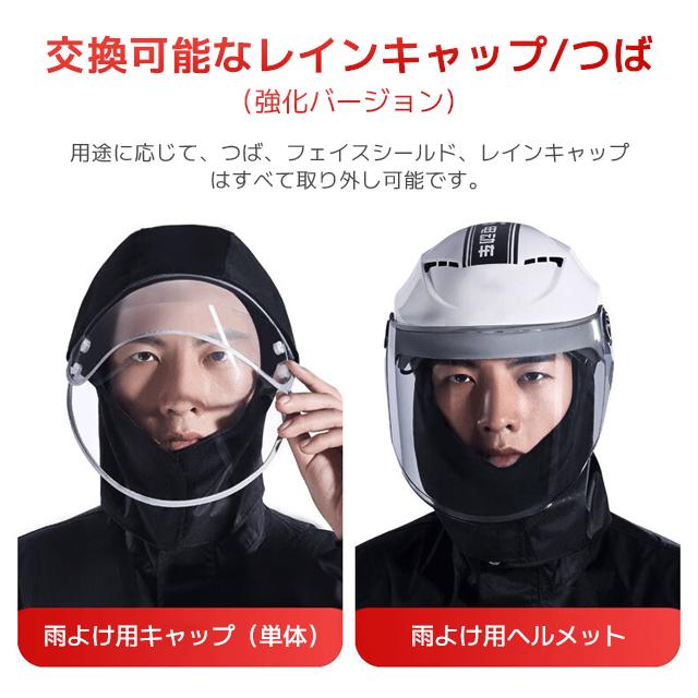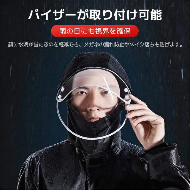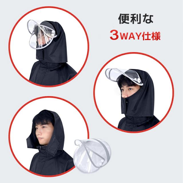 | 大きな二重つば付き | ◆フードに透明で取り外し可能なレインバイザーが装着されており、視界をクリアにしながら防滴、防風、防雪の効果を発揮します。 ◆顔をしっかり遮蔽するため、斜めからの雨でも顔が濡れず、風の強い日でもフードが飛ばされることがありません。 ◆フードは、雨水が入り込まないように調整することができます。 ◆これがあれば、傘を差さずに、視界を遮ることなく安全に運転できるので、自転車やバイク、原付バイクを運転するときにとても便利です。 |