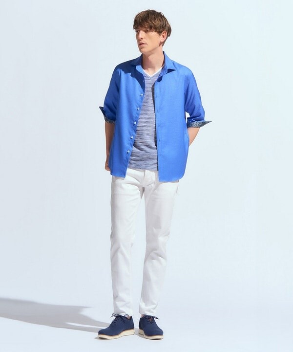 優しい肌触りで凸凹感が肌との接触面積を少なくし、さらに吸水速乾性の高いABS加工を施しているので、より清涼感のある着心地を実現しています。軽い着心地ですが、ほど良い肉感で適度なコシがある心地よい一着です。
