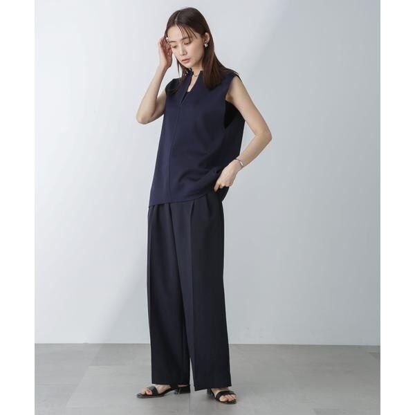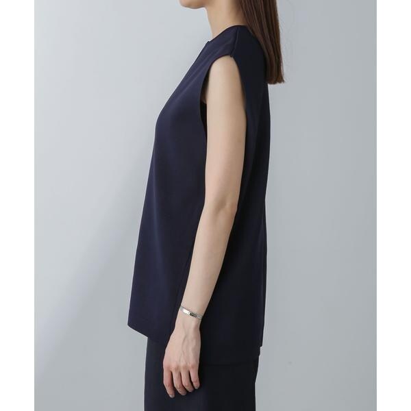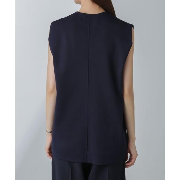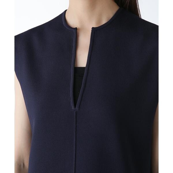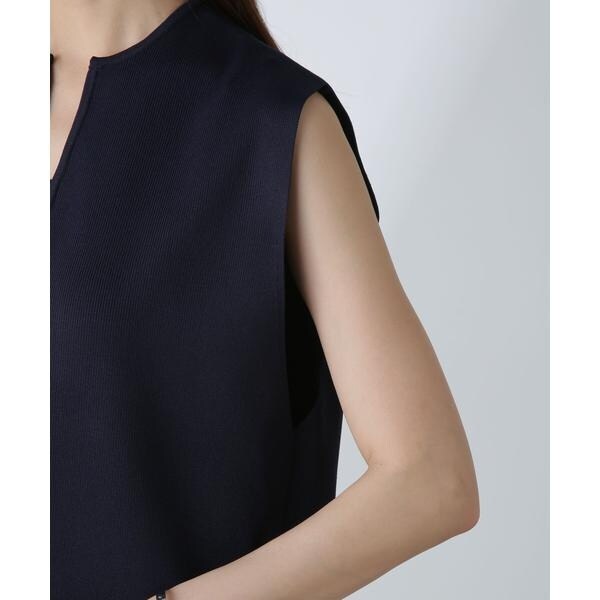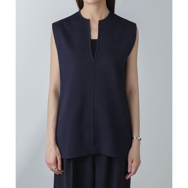 着こなしのアレンジを楽しめるノースリーブニット。深めに開いたキーネックデザインで、すっきりとした印象に仕上がるのが魅力的。下にカットソーをインしてジレとしてレイヤードする等、合わせるアイテムにより幅広く着回せる一品です。