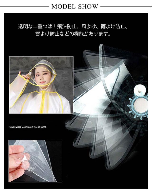 | 自転車やバイクでの通勤 通学に!おしゃれで実用的なレインコート。 透明な二重つば!飛沫防止、風よけ、雨よけ防止、雪よけ防止などの機能があります。 環境に優しい新型防水EVA素材作られ、無味無臭で、着心地が良いのです。 通気性が抜群ので、真夏でも安心使用。厚手ながら丈夫で、柔らかくて破れにい、防水性もバッチリ。 さまざまなシーンに適用・自転車・オートバイ リュック対応!四季やアウトドアに適しています。 | |
