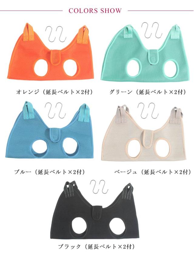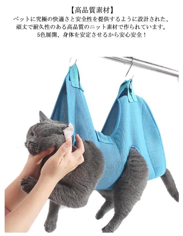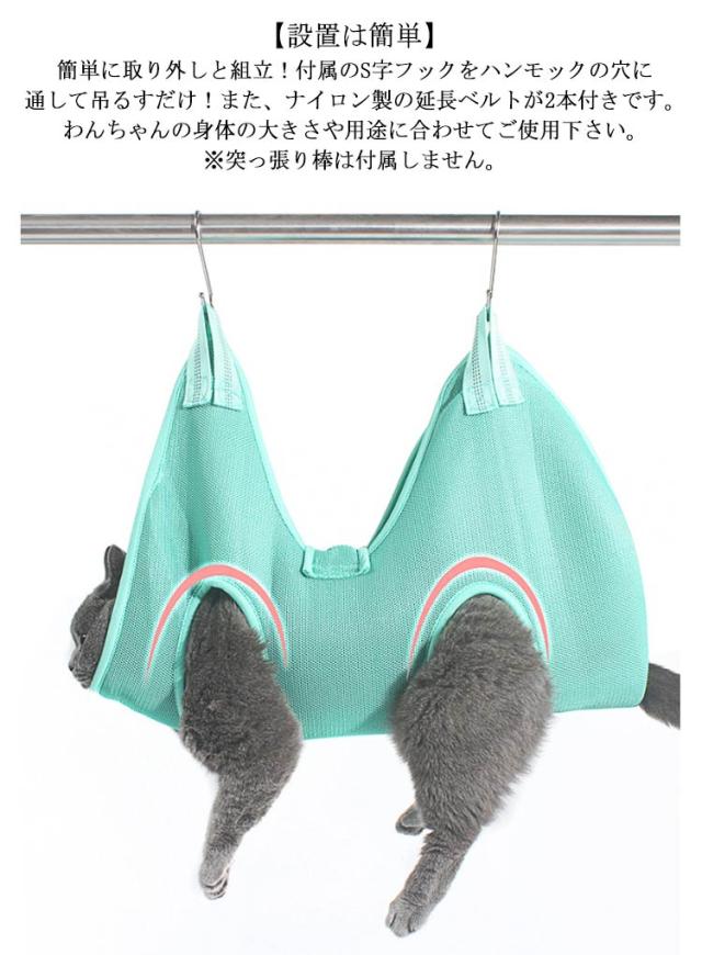 | グルーミングハンモック 美容/お風呂/介護用 S字フック付き 延長ベルト付き 【多機能】 ペットのハンモックヘルパーは爪切り、肉球トリミング、耳のケア、歯みがき、目薬・涙やけケア、服薬などに使用できます。 それはあなたのペットをとても快適に感じさせてリラックスさせることができます。 【マジックテープのベルトで360°しっかり固定】 従来のフックタイプに加えて、すり抜け防止タイプもご用意!体の柔らかい猫ちゃんでも対応できるように、体を一周ぐるっと留められるベルトを採用しました。 ペットの体を優しく包み込み、動きをうまく制限し、安全に自宅ケアができます。 【高品質素材】 ペットに究極の快適さと安全性を提供するように設計された、頑丈で耐久性のある高品質のニット素材で作られています。5色展開、身体を安定させるから安心安全! 【通気性抜群】 通気性抜群のメッシュ素材を採用しておりますので、長時間使用しても蒸れにくい仕様となっております。 【お手入れが簡単】 ペットハンモックは手洗いや洗濯機洗いに使用でき、すばやく乾かします。 ペットグルーミングハンモックを使用すると、シンプルで快適なグルーミング手順でペットを幸せで健康に保つことができます。 【設置は簡単】 簡単に取り外しと組立!付属のS字フックをハンモックの穴に通して吊るすだけ! また、ナイロン製の延長ベルトが2本付きです。わんちゃんの身体の大きさや用途に合わせてご使用下さい。 ※突っ張り棒は付属しません。 | |