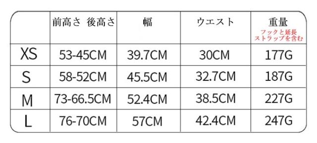 | サイズ | XS(フック×2付き) S(フック×2付き) M(フック×2付き) L(フック×2付き) |