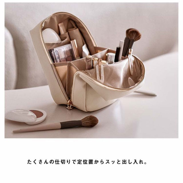 | どこになにがあるかわかる一目でわかる化粧ポーチ。 高さがある作りでチューブやリップなど縦に長いコスメを立てたまま収納できるから、使用したいものをすぐに取り出せる。 たくさんの仕切りで定位置からスッと出し入れ。 見た目以上の収納力、毎朝のフルメイク道具がまとめて入ります。旅行・出張やお泊りはもちろん ジムや職場のロッカーなどどの置きポーチとしても便利です。 厳選された上品なPUレザーを使用した高見えポーチ、誕生日プレゼントやギフトとしてもお勧めです。 | |