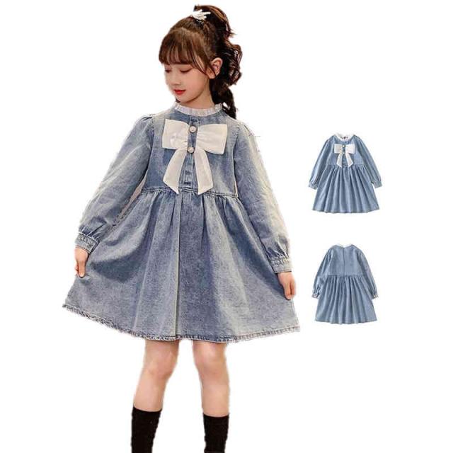 キッズ ロング 長袖 ロングワンピース 女児用 フレアワンピース かわいい デニムワンピース デニム 子供ワンピ 女の子 子供服 シンプル デニム ワンピース フレア シンプル Aライン 春 秋 送料無料 丸襟 無地 カジュアル おしゃれ リボンワンピース