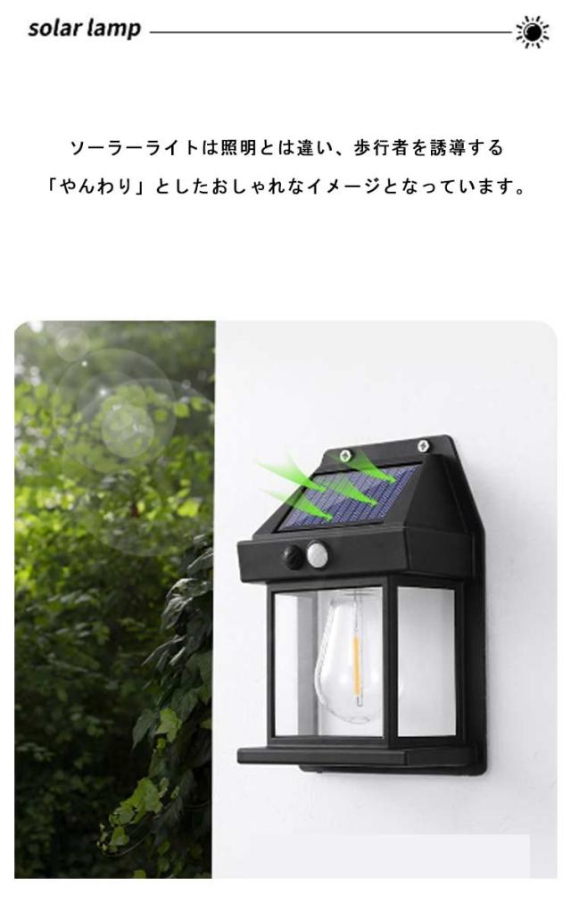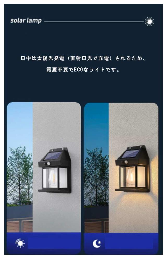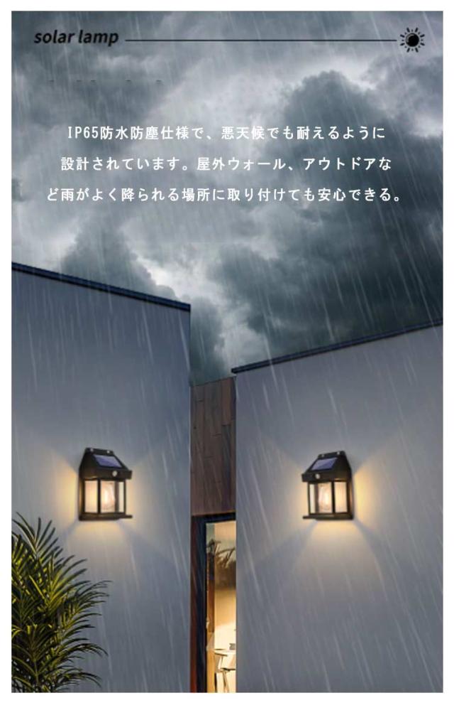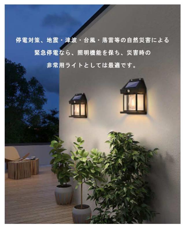 | 必要な時しか自動点灯しない省エネセンサーライトです。 外壁、フェンス、ベランダ、バルコニー、エントランス、玄関、などをお洒落にライトアップする明るいLEDライト 。 ソーラーライトは照明とは違い、歩行者を誘導する「やんわり」としたおしゃれなイメージとなっています。 ソーラー部分にセンサーが内蔵されており、夜間は自動でON状態になります。 日中は太陽光発電(直射日光で充電)されるため、電源不要でECOなライトです。 IP65防水防塵仕様で、悪天候でも耐えるように設計されています。屋外ウォール、アウトドアなど雨がよく降られる場所に取り付けても安心できる。 停電対策、地震・津波・台風・落雷等の自然災害による緊急停電なら、照明機能を保ち、災害時の非常用ライトとしては最適です。 | |