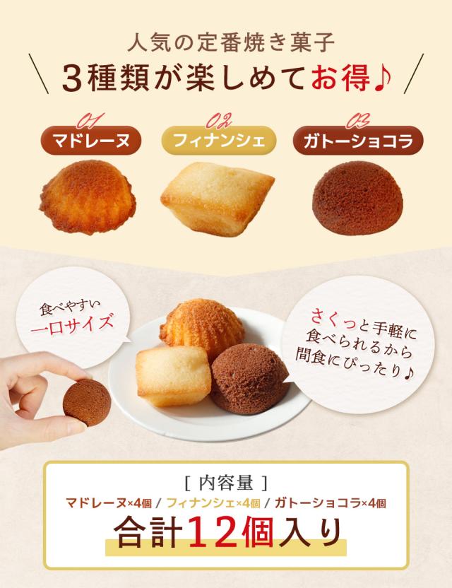 マドレーヌ、フィナンシェ、ガトーショコラの定番焼き菓子を詰め合わせたお子様から大人の方まで幅広く喜んでもらえるプチスイーツ。