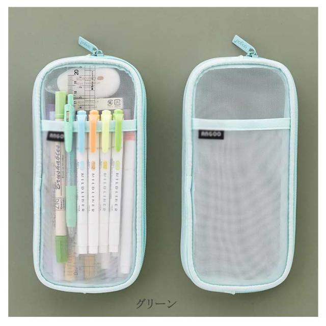 | 中が見える!メッシュ生地の丈夫なペンケース。 何が入っているのが一目瞭然!ペンを探す時間を省くことができます。 薄手でコンパクトなサイズで持ち運びに便利!学生の方はもちろん、オフィスシーンにもおすすめ。 コンパクトなのに大容量!筆記用具や文房具の持ち歩き用に最適。 よく使うペンを前ポケットに挿し、使いたい時にはサッと取り出せます。 | |