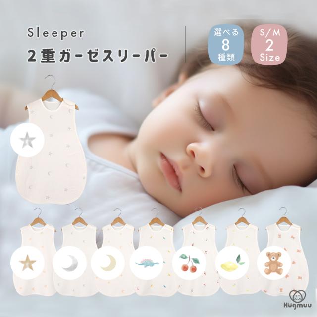 スリーパー 2重ガーゼ コットン ベスト 袖なし 足まですっぽり かわいい 月 星 さくらんぼ レモン くま 恐竜 春 夏 秋 1年中 赤ちゃん ベビー Hugmuu ハグムー