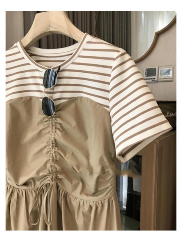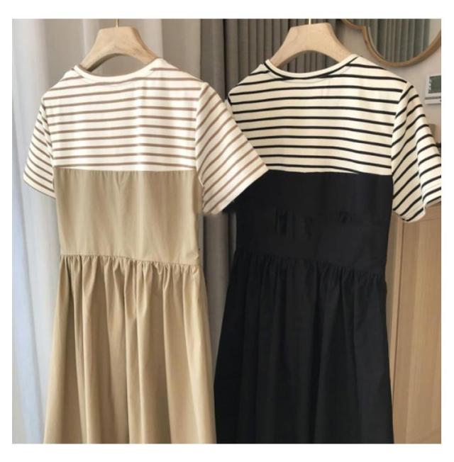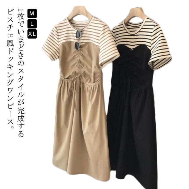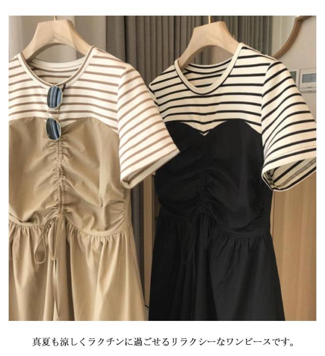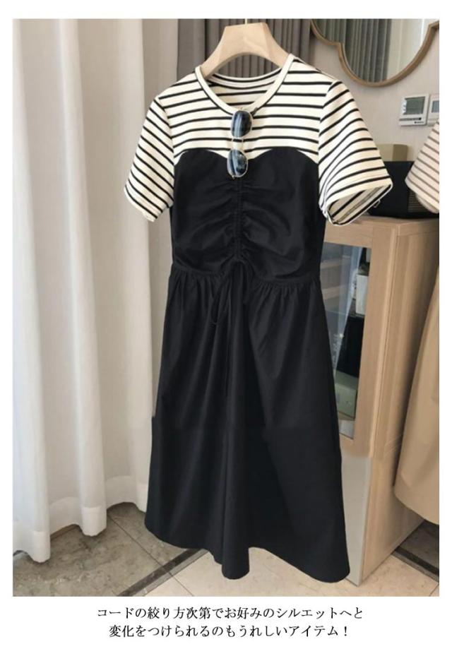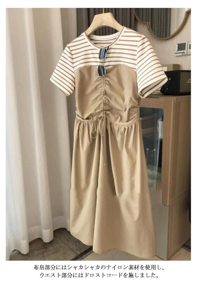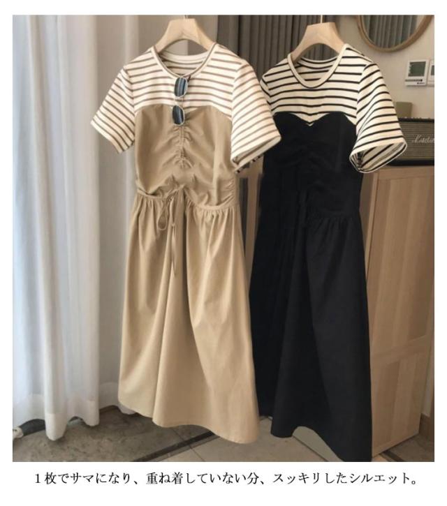 ボーダー ロング丈 半袖 ワンピースドレス 切り替え シンプル カジュアル ゆったり ロング丈 ミディアム Uネック ボートネック 抜け感 こなれ感 女性 大人 大人カジュアル オフィス オフィスカジュアル 大人可愛い