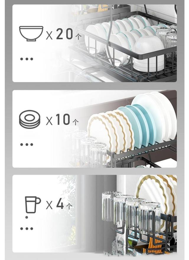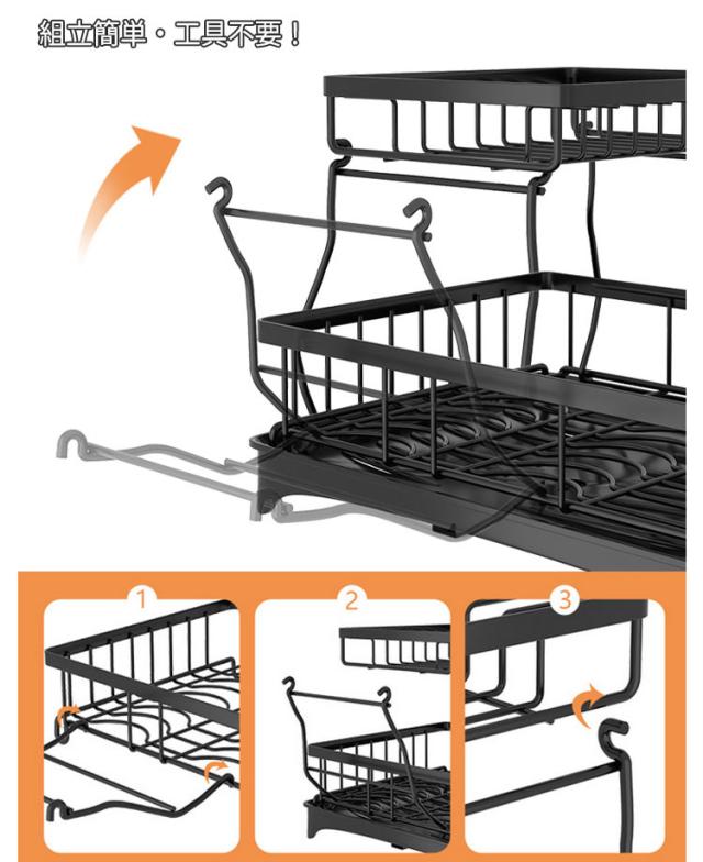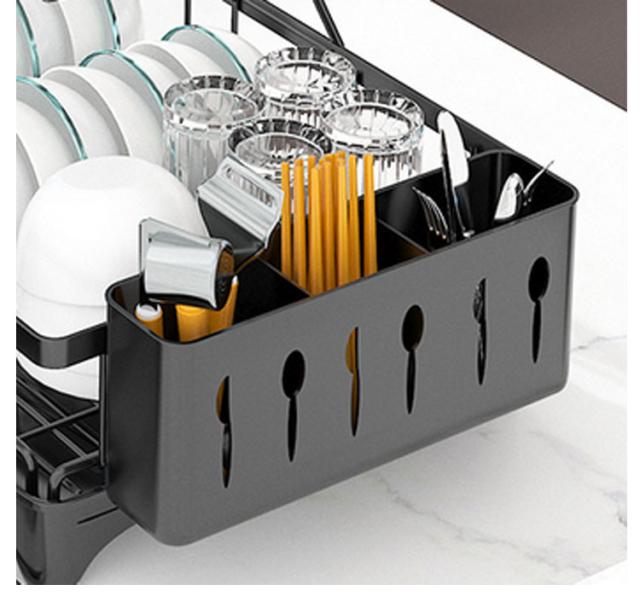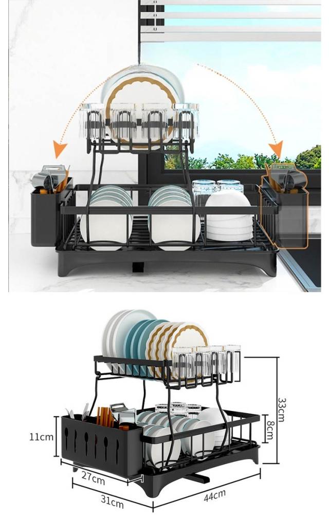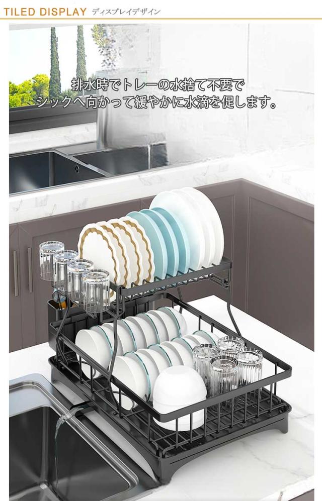| 2段式食器ラックですので、お皿や茶碗、箸、スプーン、カップ等を一括に収納できます。 水が流れるトレーと排水口が付いているので、トレーに水が貯まりません。排水時でトレーの水捨て不要でシックへ向かって緩やかに水滴を促します。360度回転できる排水パイプにより、シンクがどこでも円滑に排水できます。 本体は丈夫なステンレス製です。 組立簡単・工具不要! | |