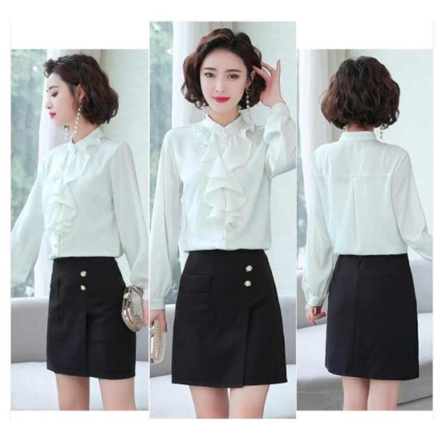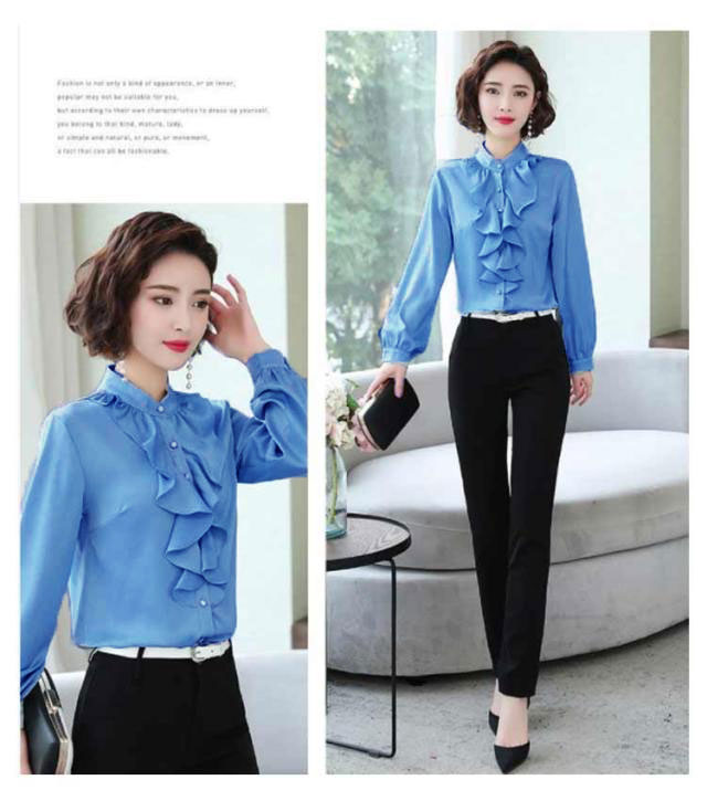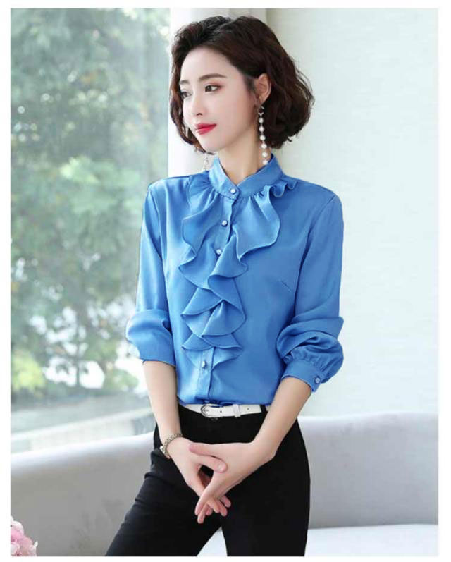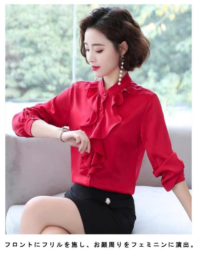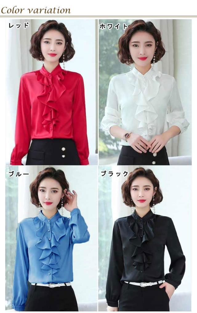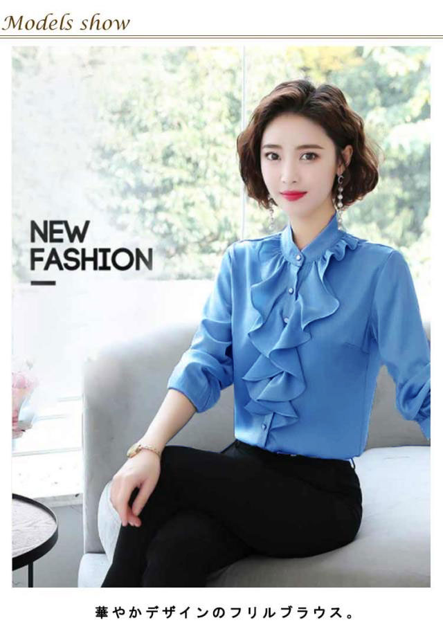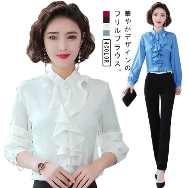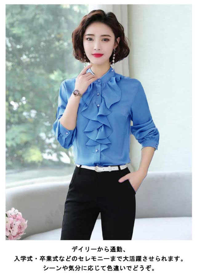 爽やか シャツ 春 スーツ 長袖 長袖 フォーマル フリル 立ち襟 春 レディース 通勤 トップス ブラウス フォーマル インナー 秋冬 入学式 入園 卒業 卒園 白 薄手 フリルブラウス OL オフィス カジュアル ブルー ホワイト オフィス