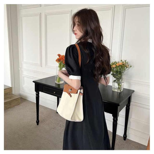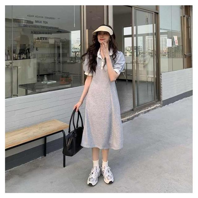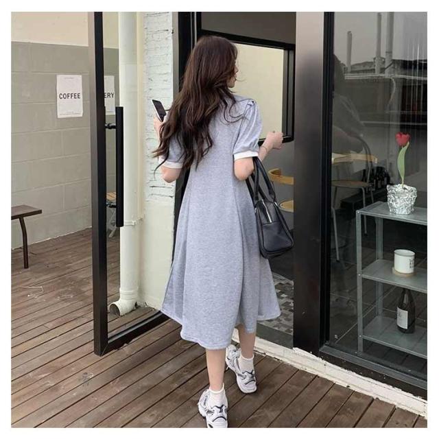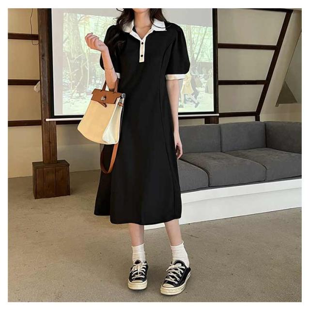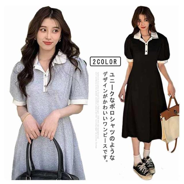 ポロワンピース ポロシャツ ワンピース レディース 半袖 ポロ衿 夏 ミモレ丈 大きいサイズ 襟付き パフスリーブ スポーティー ポロシャツ風 配色 カットソー Aライン カジュアル サマーワンピース Tシャツワンピース