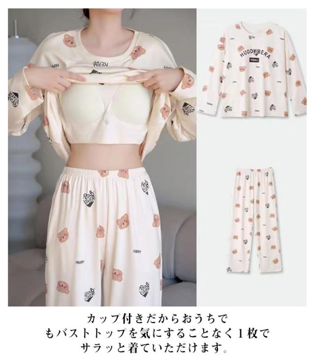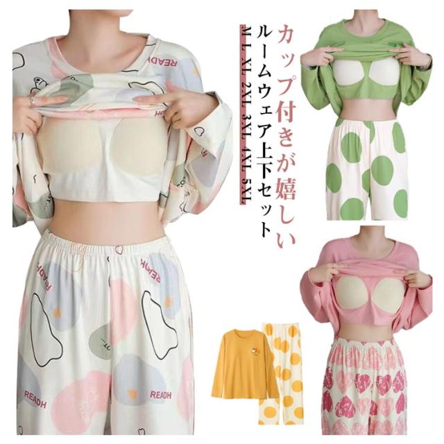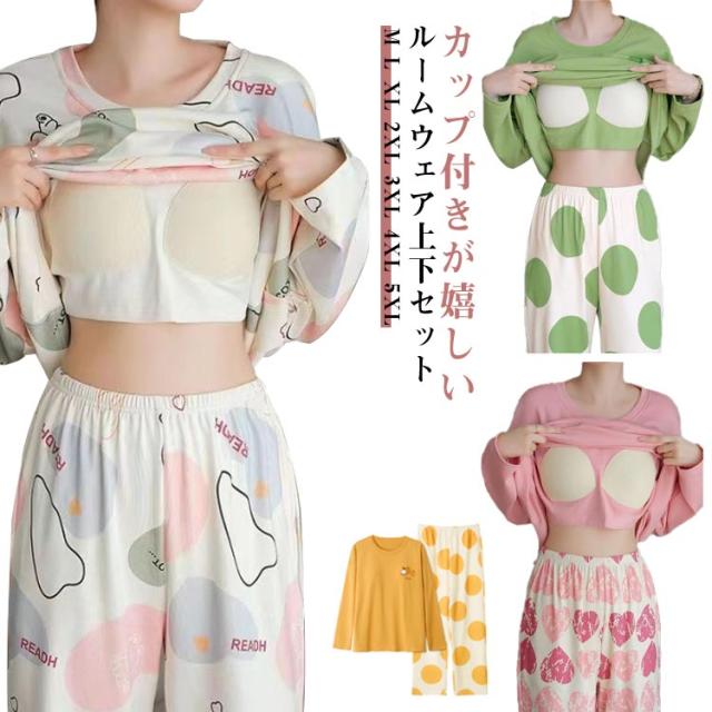 カップ付き Tシャツ パジャマ レディース 寝間着 大きいサイズ 長袖 上下セット ナイトウェア 薄手 カップ付き 寝巻き 部屋着 ロングパンツ ブラトップ パッド付き 母の日 プレゼント 春