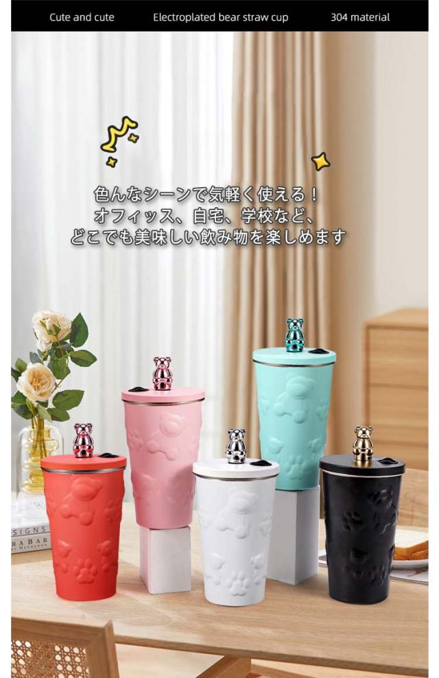 | 超かわいい熊デザインの真空断熱水筒。 女の子も片手で握られるサイズ、落としにくい。 ワイドサイズ設計で、氷を入れることが便利です。 様々な飲み物に適用!寒いものも、熱いものも入れられる。 真空断熱層!熱量が伝わりにくく、保冷保温効力が長持ち。 色んなシーンで気軽く使える!オフィッス、自宅、学校など、どこでも美味しい飲み物を楽しめます。 | |