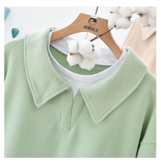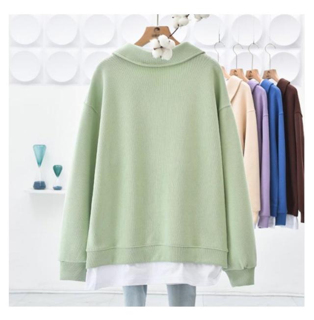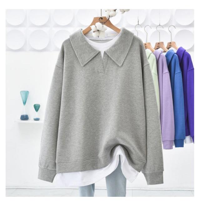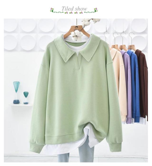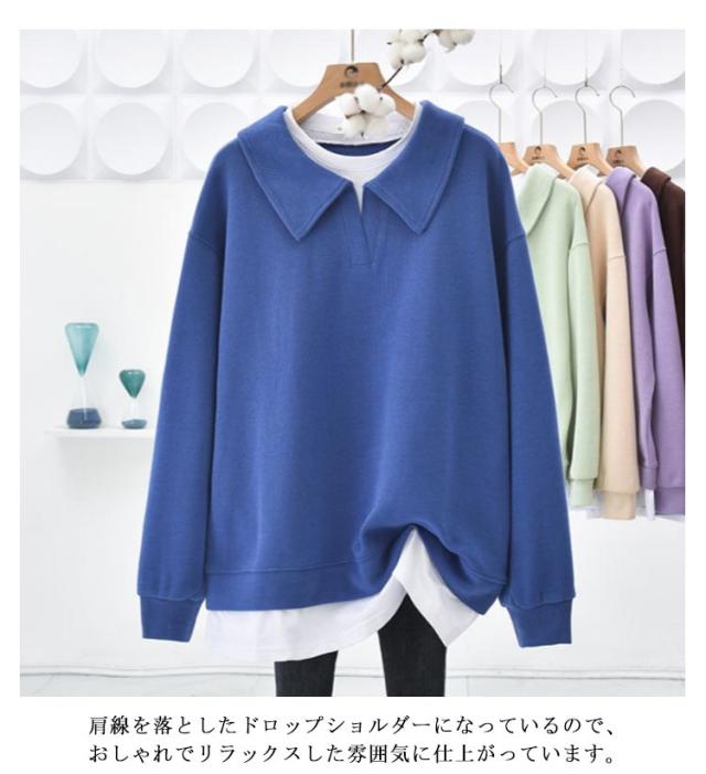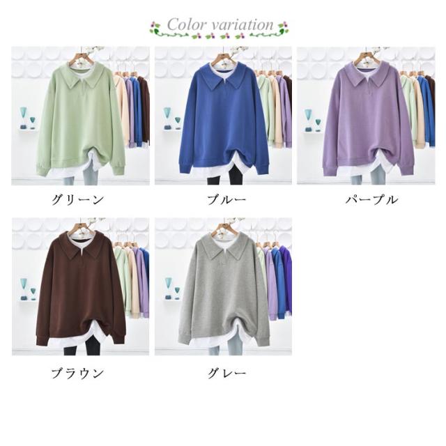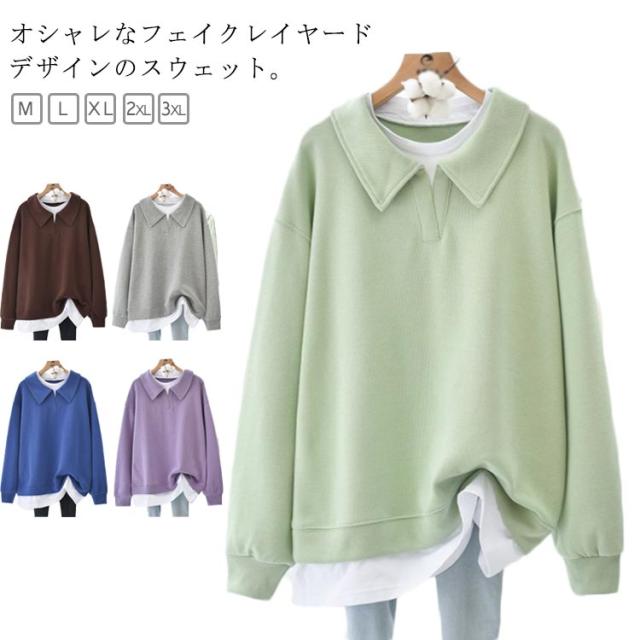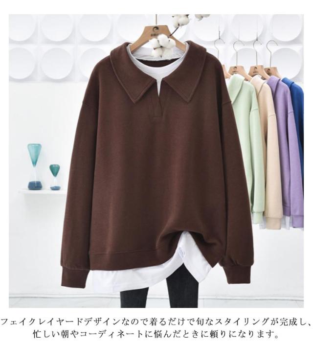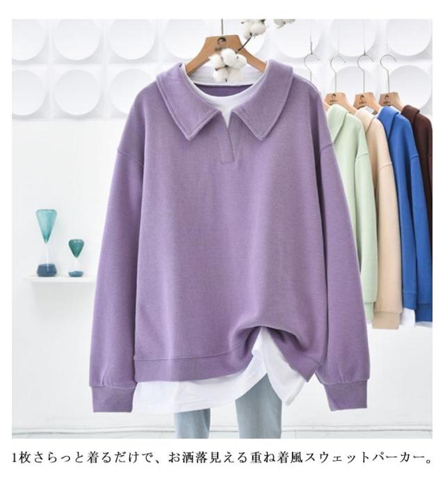 パーカー 重ね着風トレーナー トップス ドロップショルダー 重ね着風トレーナー レディース 無地 カジュアル 長袖 体型カバー プルオーバー フェイクレイヤード ポロ襟 シンプル 春秋 スウェット カットソー グリーン ブルー パープル ブラウン グレー