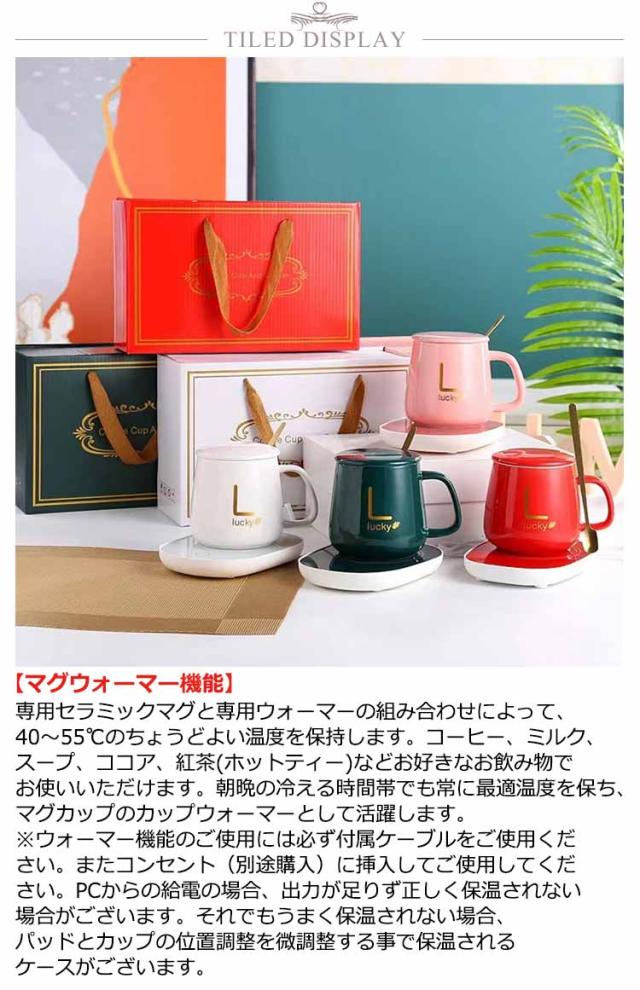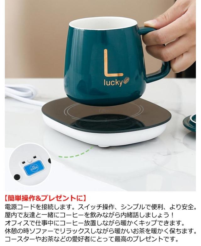 | USBカップウォーマー 保温40〜55℃ 【マグウォーマー機能】 専用セラミックマグと専用ウォーマーの組み合わせによって、40〜55℃のちょうどよい温度を保持します。コーヒー、ミルク、スープ、ココア、紅茶(ホットティー)などお好きなお飲み物でお使いいただけます。朝晩の冷える時間帯でも常に最適温度を保ち、マグカップのカップウォーマーとして活躍します。 ※ウォーマー機能のご使用には必ず付属ケーブルをご使用ください。またコンセント(別途購入)に挿入してご使用してください。PCからの給電の場合、出力が足りず正しく保温されない場合がございます。それでもうまく保温されない場合、パッドとカップの位置調整を微調整する事で保温されるケースがございます。 【簡単操作&プレゼントに】 電源コードを接続します。スイッチ操作、シンプルで便利、より安全。屋内で友達と一緒にコーヒーを飲みながら内緒話しましょう!オフィスで仕事中にコーヒー放置しながら暖かくキップできます。休憩の時ソファーでリラックスしながら暖かいお茶を暖かく保ちます。コースターやお茶などの愛好者にとって最高のプレゼントです。 【優れた保温機能】 カップを暖かいパネルの中央に置いて、 水、コーヒー、飲料、牛乳、お茶などを加熱できます。カップにお湯または冷水が入っていると、水温はゆっくり下がるかまたは上がり、40-60℃ぐらいを維持できます。 【幅広い適用範囲】 USBケーブル仕様の携帯サイズなので、場所を取らず、職場や自宅やカフェ等、いつでもどこでも、暖かいドリンクをお楽しみ頂けます。また、付属のマグカップ以外、他のカップでも使用できます。(1)陶器、ステンレス、ガラス材、紙カップのカップが適用ですが、プラスチック製カップは利用不可です。(2)また、カップ底が厚すぎ、凹みの場合なら加熱効果も大きく下げてすごく時間かかるかもしれません。 | |