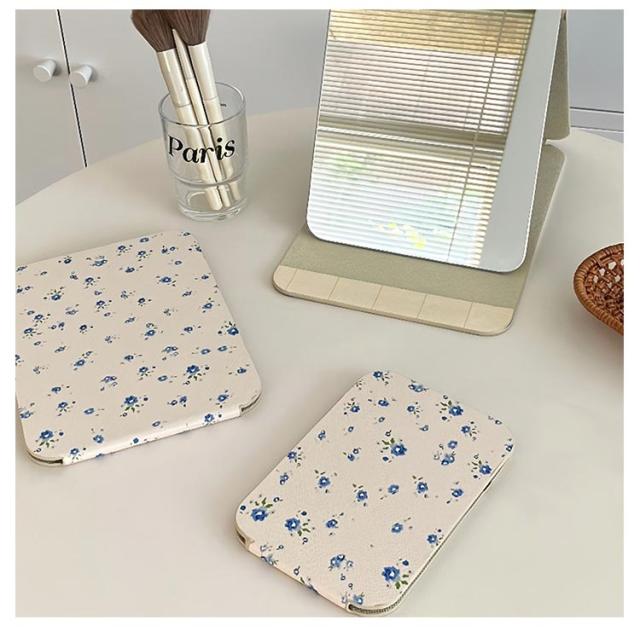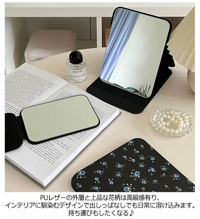 | 小花が可愛い大人のための折りたたみ式卓上ミラー。 インテリアとしても持ち運び用としてもかわいい折りたたみミラーです。 片手で角度調整自在でメイクやヘアセットなどに最適、使い勝手抜群! 無駄なフレームを無くす事で鏡面が広く化粧がしやすい。 使わない時に折り畳んでカバンに入れてもかさばらず持ち運び便利で、いつでもどこでもメイクタイムを快適に! PUレザーの外層と上品な花柄は高級感有り、インテリアに馴染むデザインで出しっぱなしでも日常に溶け込みます。持ち運びもしたくなる♪ | |