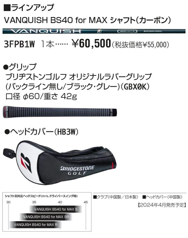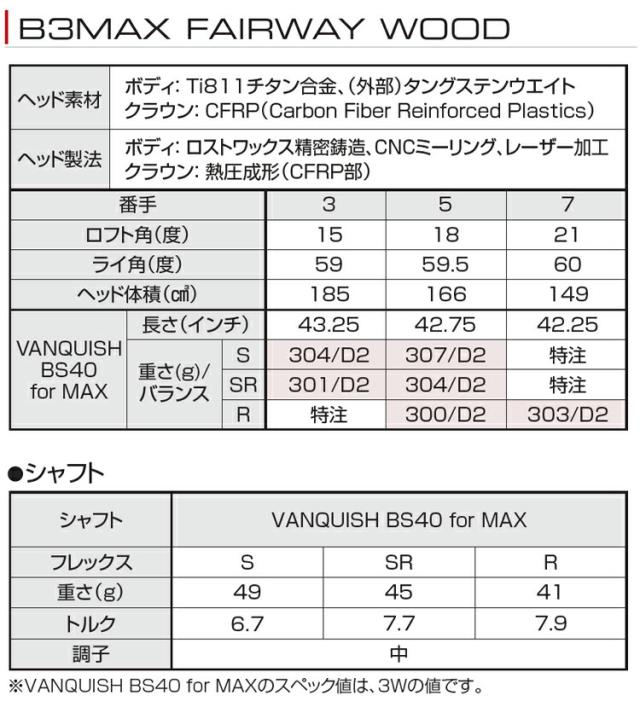 ブリヂストンゴルフ Bシリーズ B3MAX フェアウェイウッド VANQUISH BS40 for MAXカーボンシャフト 「BRIDGESTONE GOLF B Series B3MAX FAIRWAY WOOD」 4月5日(金)発売予定 2024年モデル日本正規品