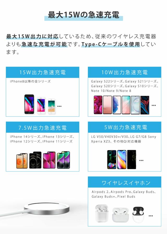 【即日発送】ワイヤレス充電器 急速 15W iPhone Android 急速充電 マグネット Xperia Galaxy 充電器 AirPods type-c ワイヤレスチャージャー 薄型 軽量