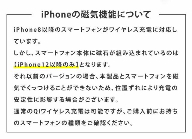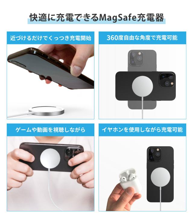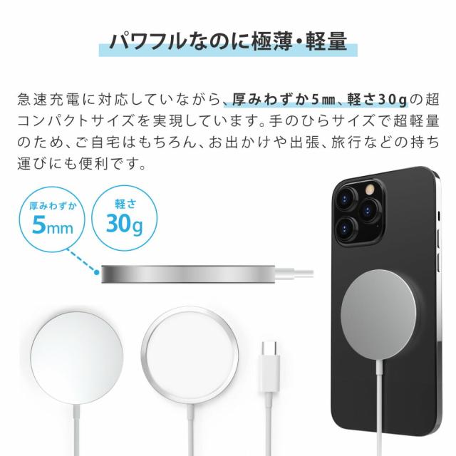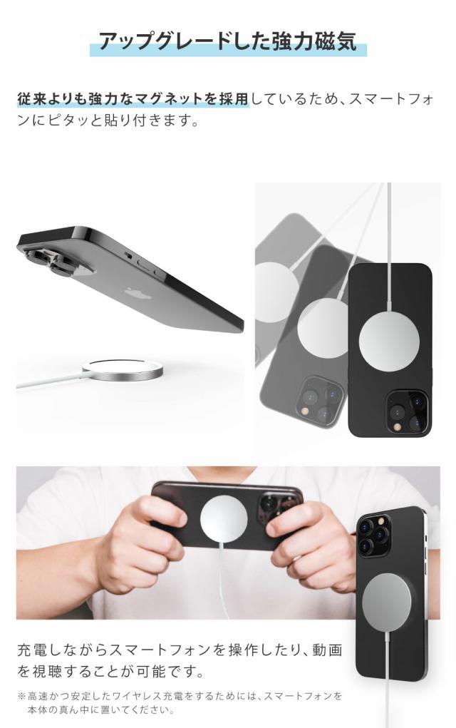 | 商品説明 | 2024年新発売!最大15W出力に対応しているマグネット式ワイヤレス充電器が登場しました! 最大15Wの急速充電が可能なため、充電時間を短縮します。 また、ケースをつけたままでも充電可能な強力磁気や、パワフルなのに極薄・軽量など、様々な機能がアップグレードしてより使いやすくなりました。 |