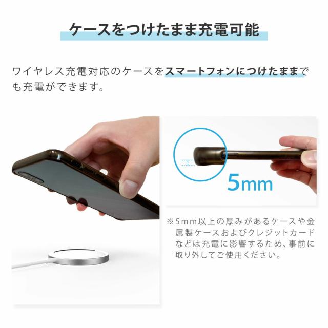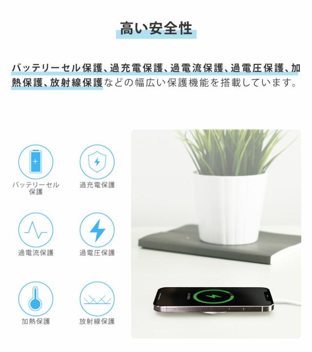 | 商品特徴 | ■最大15Wの急速充電 最大15W出力に対応しているため、従来のワイヤレス充電器よりも急速な充電が可能です。 Type-Cケーブルを使用しています。 <対応機種の一例> ・15W出力急速充電:iPhone8以降の全シリーズ ・10W出力急速充電:Galaxy S22シリーズ、Galaxy S21シリーズ、Galaxy S20シリーズ、Galaxy S10シリーズ、Note ・10/Note 9/Note 8 ・7.5W出力急速充電:iPhone 14シリーズ、iPhone 13シリーズ、iPhone 12シリーズ、iPhone 11シリーズ ・5W出力急速充電:LG V50/V40V30+/V30、LG G7/G8 Sony Xperia X23 その他Qi対応機器 ・ワイヤレスイヤホン:Airpods 2、Airpods Pro、Galaxy Buds、Galaxy Buds+、Pixel Buds ※Galaxy S24 ultraなど一部対応していない機種がございます。 ※7.5W以上の出力を行う際は、QC2.0/3.0もしくはPD対応充電器(別売り)が必要です。 ■アップグレードした強力磁気 従来よりも強力なマグネットを採用しているため、スマートフォンにピタッと貼り付きます。 そのため、充電しながらスマートフォンを操作したり、動画を視聴することが可能です。 ※高速かつ安定したワイヤレス充電をするためには、スマートフォンを本体の真ん中に置いてください。 <iPhoneの磁気機能について> iPhone8以降のスマートフォンがワイヤレス充電に対応しています。 しかし、スマートフォン本体に磁石が組み込まれているのは【iPhone12以降のみ】となります。 それ以前のバージョンの場合、本製品とスマートフォンを磁気でくっつけることができないため、位置ずれにより充電の安定性に影響する場合がございます。 通常のQiワイヤレス充電は可能ですが、ご購入前にお持ちのスマートフォンの種類をご確認ください。 ■ケースをつけたまま充電可能 ワイヤレス充電対応のケースをスマートフォンにつけたままでも充電ができます。 ※5mm以上の厚みがあるケースや磁気を帯びたケース、金属製ケースおよびクレジットカードなどは充電に影響するため、事前に取り外してご使用ください。 ■パワフルなのに極薄・軽量 急速充電に対応していながら、厚みわずか5mm、軽さ30gの超コンパクトサイズを実現しています。 手のひらサイズで超軽量のため、ご自宅はもちろん、お出かけや出張、旅行など持ち運びにも便利です。 ■シンプルなデザイン シンプルさを追求したデザインに仕上げました。 睡眠の妨げにならないよう、LEDライトもなくしたデザインにアップグレードしています。 ■高い安全性 バッテリーセル保護、過充電保護、過電流保護、過電圧保護、加熱保護、放射線保護などの幅広い保護機能を搭載しています。 |